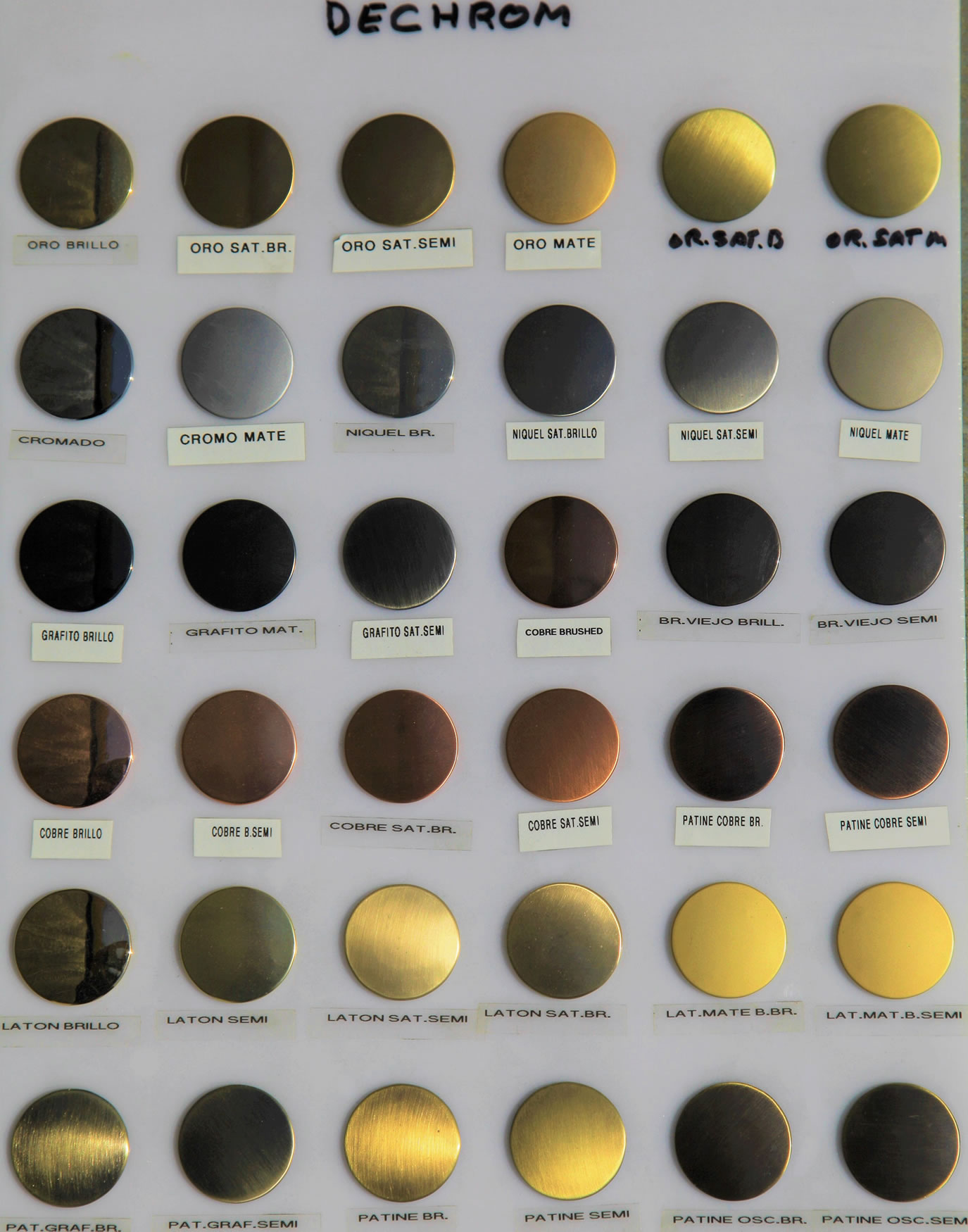 DeChrom. Nos dedicados al recubrimiento metálico decorativo desde 1984 con una gran gama de acabados superficiales, desde los tradicionales cromados, dorados y cobreados a los baños de oro, oro brillante, oro envejecido, cromado brillante, cromado mate, grafito, cobreado brillante, cobreado mate, cobreado satinado, niquel químico. Los aplicamos en metales como latón, acero inoxidable, zamak, hierro, aluminio de extrusión y fundición
